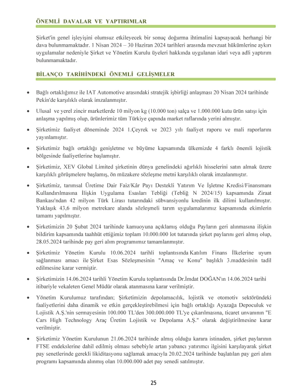 Şirketin faaliyetleri, yatırımları, Ar-Ge faaliyetleri, finansal bilgiler ve hisse performansı gibi birçok önemli bilginin yer aldığı faaliyet raporundan bazı satır başları şu şekilde;