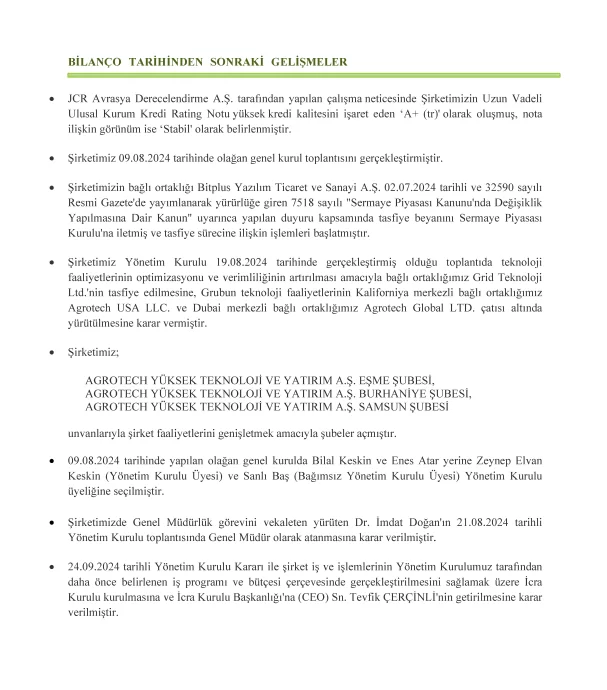 Agrotech Yüksek Teknoloji ve Yatırım A.Ş. (AGROT), 27 Eylül 2024 tarihinde Kamuyu Aydınlatma Platformu’na (KAP) yaptığı açıklamada, şirketin 6 aylık Faaliyet Raporu’nu paylaştı. Ayrıca, rapor öncesinde duyurulan 2. çeyrek bilançosuna haberin sonunda ulaşabilirsiniz.