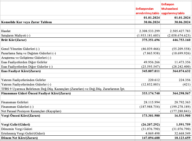 Uygulanan enflasyon muhasebesi nedeniyle, ilgili mevzuat gereği arındırılmış dönem karının 470.710.841 TL olması gerekirken, yalnızca 46.047.315 TL dönem zararı açıklandı. Bu durum, yatırımcıların ve piyasa analistlerinin, enflasyon muhasebesinin firmaların kârlılığını nasıl etkilediğini daha iyi anlamalarına olanak sağlıyor.