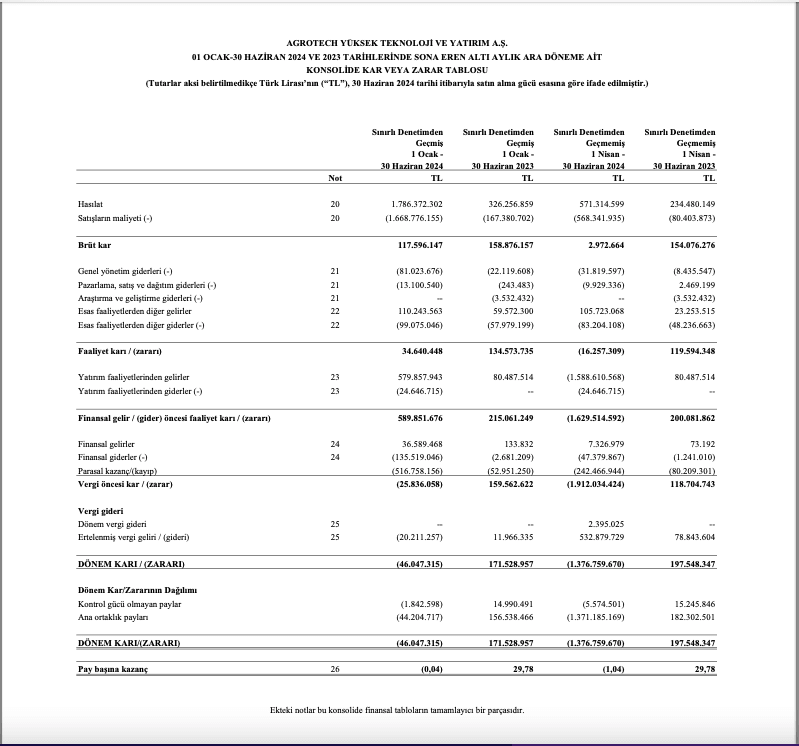 Agrotech Yüksek Teknoloji ve Yatırım A.Ş.’nin 30 Haziran 2024 tarihinde KAP’a bildirdiği faaliyet raporunda, firmanın finansman gelir/gider öncesi faaliyet karının 589.851.676 TL olarak gerçekleştiği, bir önceki yılın aynı dönemine göre yaklaşık %175 oranında bir artış sağladığı görülüyor. Ancak, enflasyon muhasebesi nedeniyle gerçekleşen 516.758.156 TL tutarındaki parasal kayıp neticesinde firmanın 490.922.098 TL vergi öncesi kar açıklaması beklenirken, 25.836.058 TL vergi öncesi zarar kaydedildi.