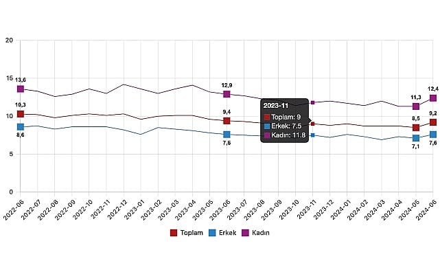 İstihdam edilenlerin sayısı 2024 yılı Haziran ayında bir önceki aya göre 341 bin kişi azalarak 32 milyon 522 bin kişi, istihdam oranı ise 0,6 puan azalarak %49,3 oldu. Bu oran erkeklerde %66,9 iken kadınlarda %32,1 olarak gerçekleşti.