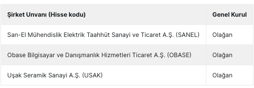 1 Temmuz 2024 Pazartesi günü Genel Kurula giden şirketler şu şekilde;