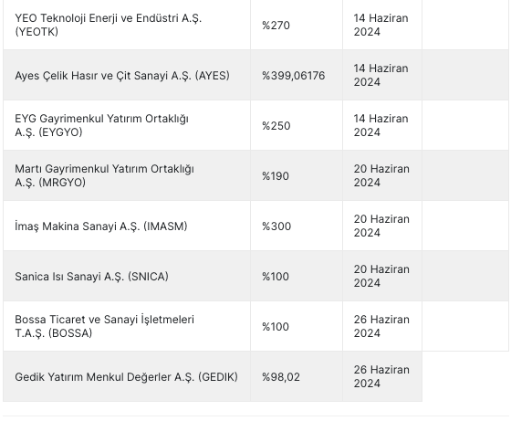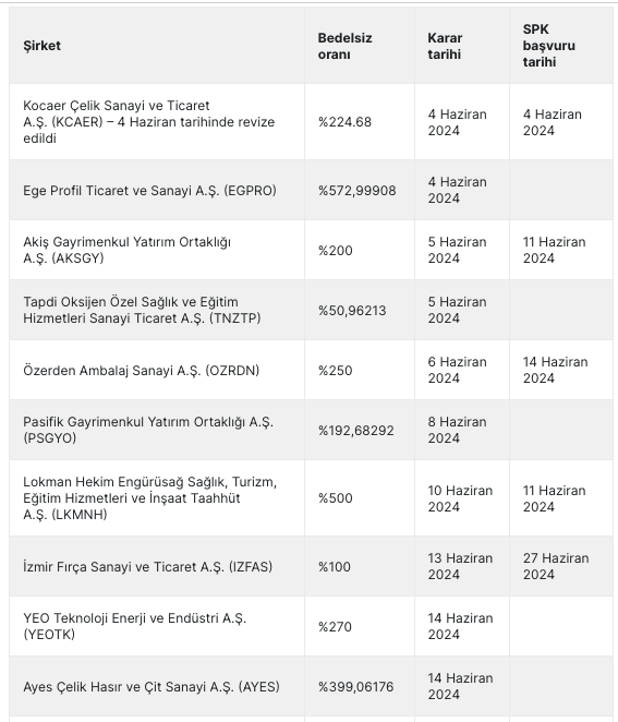 İşte Haziran ayında bedelsiz sermaye artırımı kararı alan şirketler ve detayları: