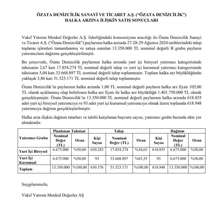 yaklaşık 3,86 katı 51.523.171 TL nominal değerli talep toplandı. Özata Denizcilik Sanayi ve Ticaret A.Ş. paylarının 27-28-29 Ağustos 2024 tarihlerinde gerçekleştirilen halka arzında satışa sunulan 13.350.000 TL nominal değerli payların %5`inden fazlasını alan yatırımcı bulunmuyor. Payların bu hafta borsada işlem görmeye başlaması bekleniyor.