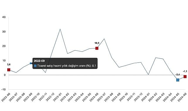 Ticaret satış hacmi (2021=100) 2024 yılı Haziran ayında bir önceki aya göre %1,0 arttı. Aynı ayda motorlu kara taşıtlarının ve motosikletlerin toptan ve perakende ticareti ile onarımı için satış hacmi %0,8 arttı, toptan ticaret satış hacmi %0,8 arttı, perakende ticaret satış hacmi ise %1,7 arttı.